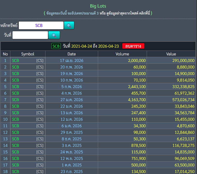 🔥BigLot 📅 23/04/2026 SCB มีมูลค่าสูงสุด 264 ล้าน ที่ราคาเฉลี่ย 132 บ.