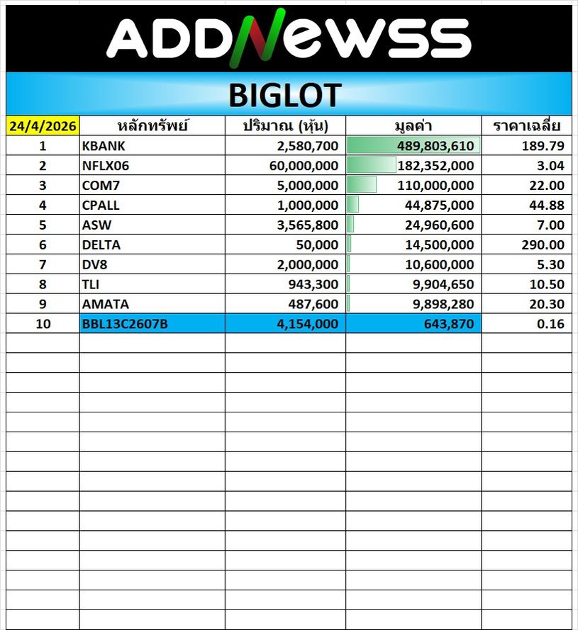🔥BigLot 📅 24/04/2026 KBANK มีมูลค่าสูงสุด 489.8 ล้าน ที่ราคาเฉลี่ย 189.79 บ.