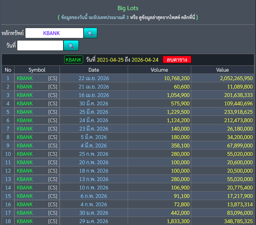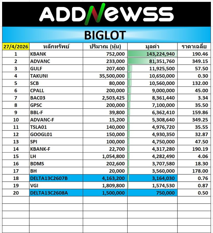 🔥BigLot 📅 27/04/2026 KBANK มีมูลค่าสูงสุด 143.2 ล้าน ที่ราคาเฉลี่ย 190.46 บ.