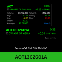 | AOT | 25/08/25 | 37.50 | (#KH) AOTGA รวบ 6.7 หมื่นล้าน ภาคพื้น-คาร์โก้สุวรรณภูมิ AOT |