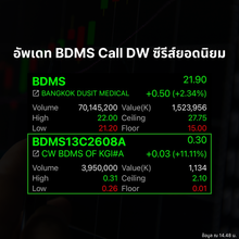 | BDMS | 04/10/24 | 29.50 | (#TH) BDMS ร่วมธุรกิจ ศรีพันวา ผุดศูนย์ Phuket Wellness |