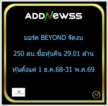 | BEYOND | 29/05/25 | 6.65 | (#KH) BEYOND คงเป้ารายได้ปีนี้พุ่ง 3.7 พันล้าน แย้มมียอดจองห้องพักโรงแรมล่วงหน้าลากยาวถึงปีหน้า |