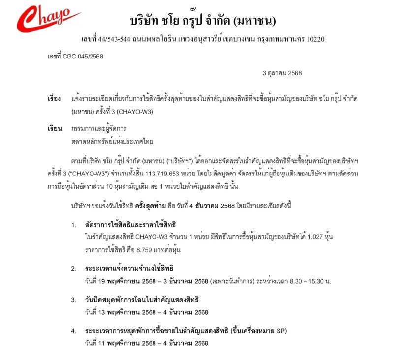 | CHAYO | 08/09/25 | 2.12 | (#TH) CHAYO รับทรัพย์เงินช่วย ธ.ก.ส. หนุนลูกค้าผ่อนชำระสินเชื่อ |