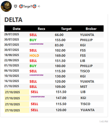| DELTA | 11/03/25 | 76.50 | (#KH) KKPS ดาวน์เกรด DELTA หั่นเป้าหมายเหลือ 50 บาท |