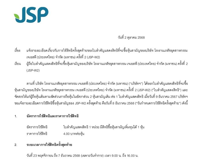 | JSP | 12/12/25 | 1.60 | (#KH) JSP มั่นใจปีนี้ยอดขาย ผลิตภัณฑ์เสริมอาหาร พุ่งทะยาน 1 พันล้านบาท |