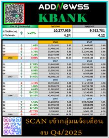 | KBANK | 20/01/25 | 161.00 | (#TH) วัด SCB KBANK KTB โชว์งบ Q4 กำไรโดดเด่น |