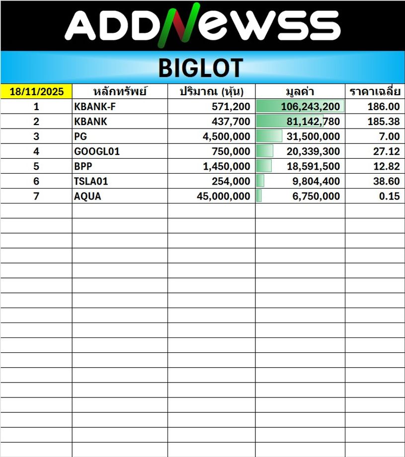 | KBANK | 14/11/25 | 182.50 | (#TH) KBANK อัพแกร่ง SC วงเงิน 2.5 พันล. พัฒนาคลังสินค้า |