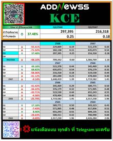| KCE | 03/01/25 | 23.80 | (#KH) KCE ไตรมาส 4/67 ฟื้น คาดกำไรกว่า 400 ล้าน แผนปี 68 เน้นลดต้นทุน |
