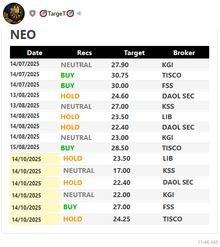 | NEO | 03/10/25 | 21.50 | (#TH) NEO เปรยครึ่งปีหลังแจ่ม รุกปั้นโรงงานใหม่ต่อยอด |