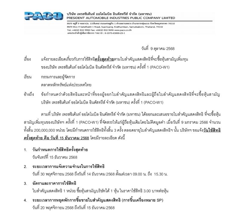 | PACO | 12/11/25 | 1.33 | (#TH) PACO เร่งคุมต้นทุน หนุนงบสวยโต 41% |