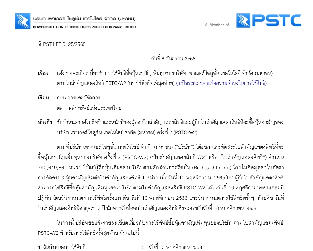 | PSTC | 01/10/24 | 0.60 | (#TH) PSTC ซื้อโซลาร์รูฟ กำลังผลิต 3.07เมก |
