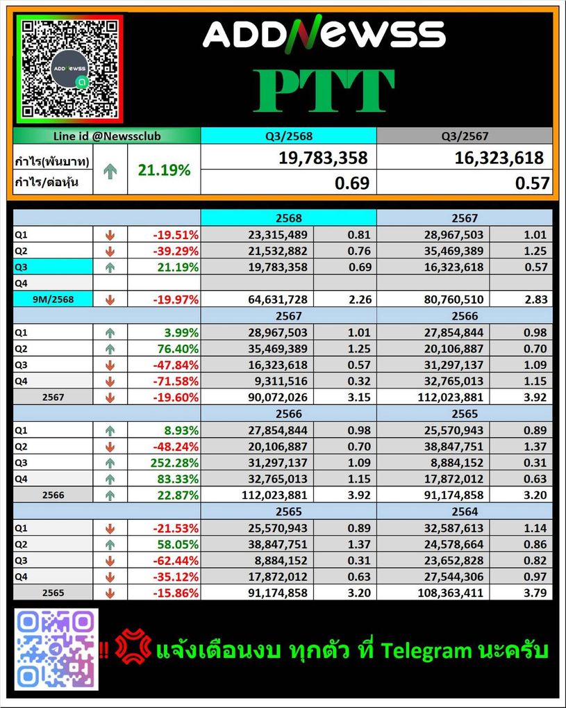 | PTT | 13/11/25 | 30.25 | (#KH) PTT ตามนัดกำไร 2 หมื่นล. ลุ้น Q4 น้ำมันดิบ 75 เหรียญ |