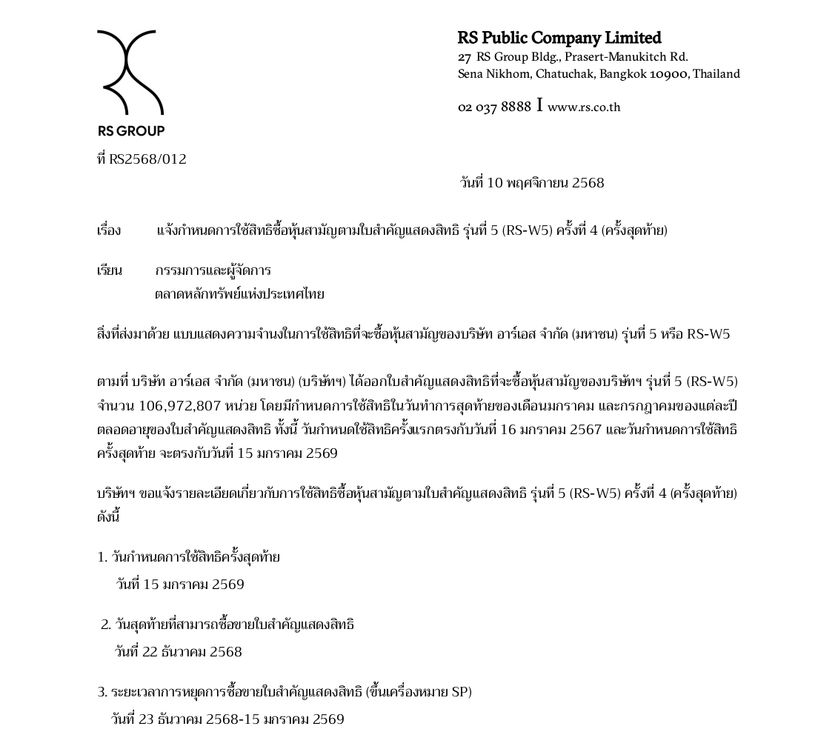 | RS | 10/01/25 | 1.81 | (#KH) RS รับผู้บริหารถูกฟอร์ซเซล เตรียมออกมาตรการป้องกัน |