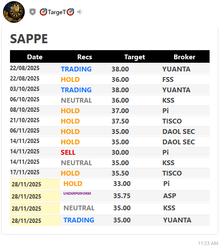 | SAPPE | 28/11/25 | 33.00 | (#KH) SAPPE คาดงบไตรมาส 4/68 ฟื้น! ตั้งเป้ารายได้ปีหน้าเติบโต 15% |