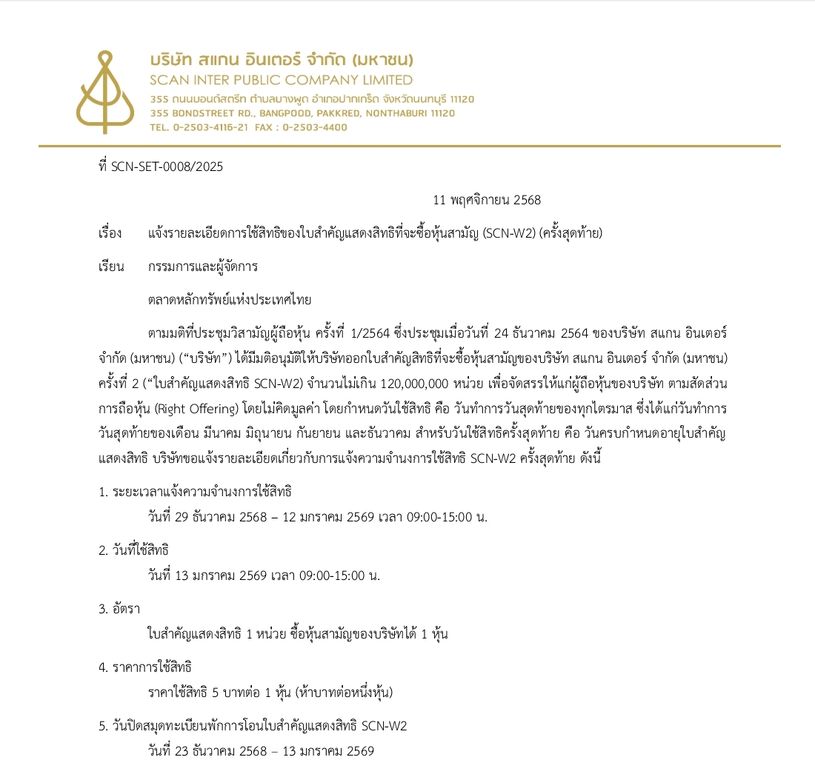 | SCN | 11/02/25 | 0.47 | (#KH) SCN ชูการเงินแกร่ง! จ่อชำระหุ้นกู้ 131 ล้าน มุ่งสร้างความเชื่อมั่น |