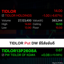 | TIDLOR | 11/10/24 | 17.90 | (#KH) TIDLOR ปลื้มหุ้นกู้ 3 พันล. ขายเกลี้ยง ปีนี้คุมหนี้ไม่เกิน 2% |