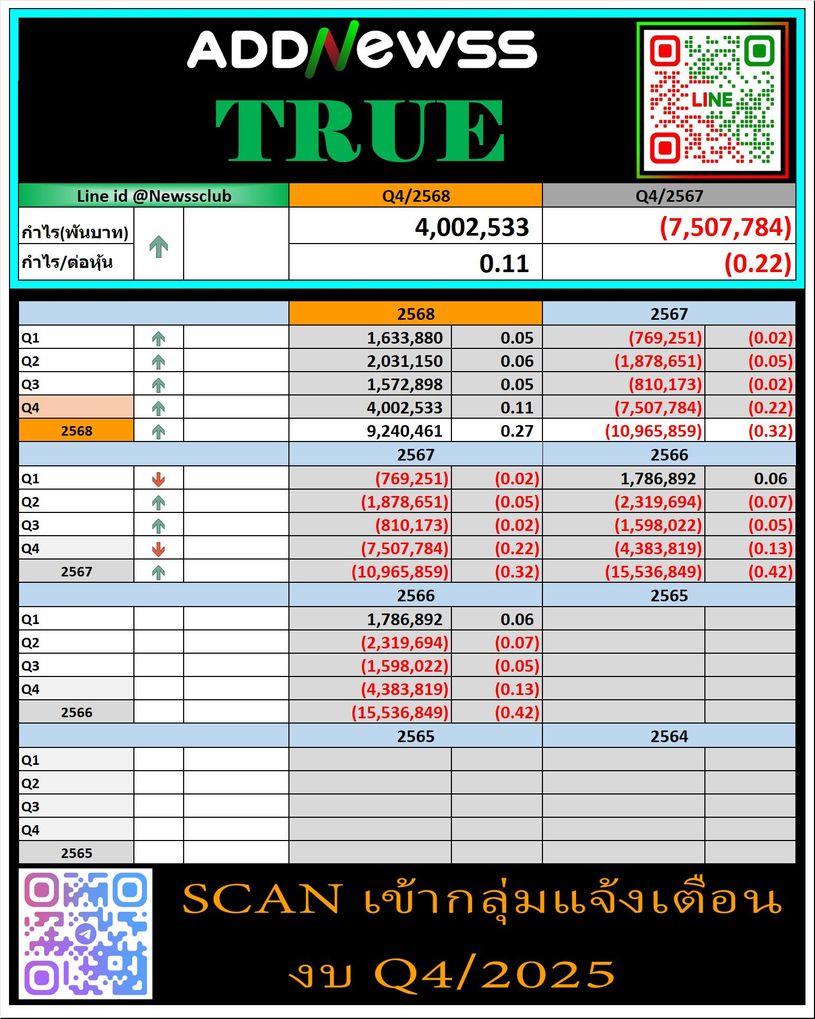 | true | 26/12/25 | 11.10 | (#KH) TRUE ลุ้นกำไร Q4 พุ่ง 3.2 พันล้าน โบรกฯ เชียร์ ‘ซื้อ’ เป้าราคา 18.20 บ. |