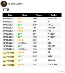 | TTB | 22/10/25 | 1.86 | (#TH) แบงก์ Q3 กำไรเกินคาด TTB KKP มีอัพไซด์ |