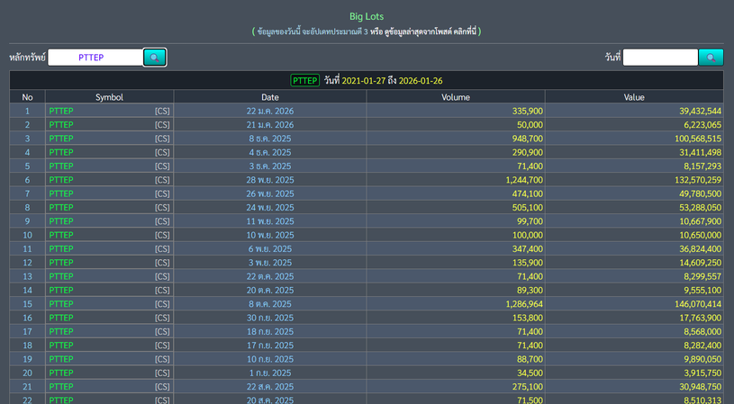 🔥BigLot 📅 26/01/2026 PTTEP มีมูลค่าสูงสุด 67.9 ล้าน ที่ราคาเฉลี่ย 119 บ.