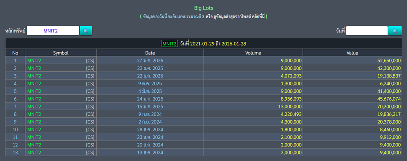 🔥BigLot 📅 28/01/2026 MNIT2 มีมูลค่าสูงสุด 31.6 ล้าน ที่ราคาเฉลี่ย 5.85 บ.
