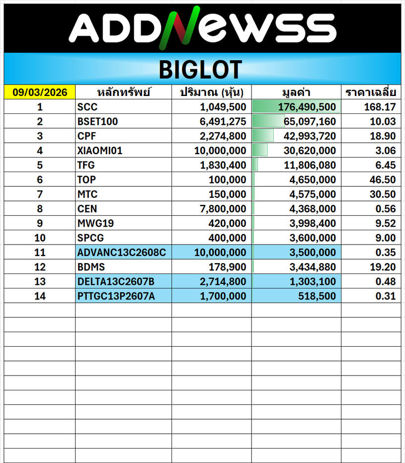 🔥BigLot 📅 09/03/2026 SCC มีมูลค่าสูงสุด 176.5 ล้าน ที่ราคาเฉลี่ย 168.17 บ.