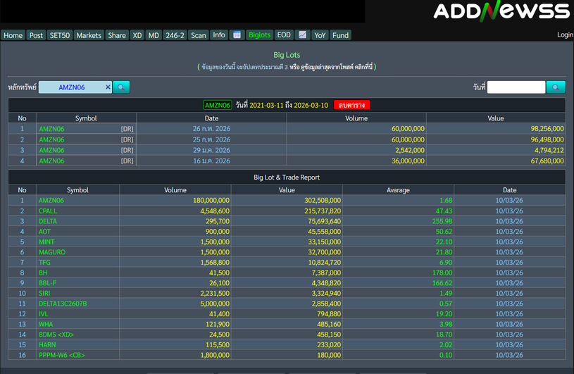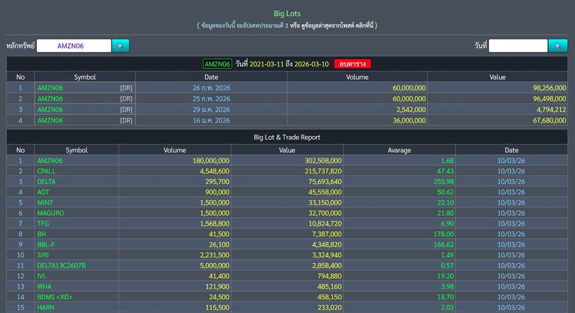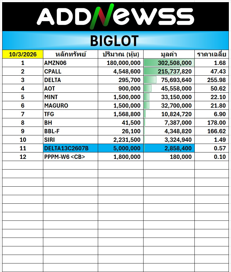 🔥BigLot 📅 10/03/2026 AMZN06 มีมูลค่าสูงสุด 302.5 ล้าน ที่ราคาเฉลี่ย 1.68 บ.