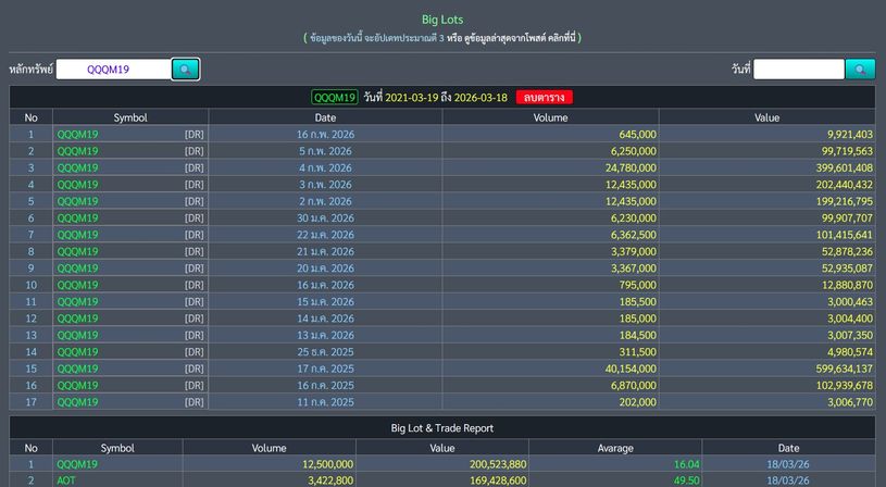 🔥BigLot 📅 18/03/2026 QQQM19 มีมูลค่าสูงสุด 200.5 ล้าน ที่ราคาเฉลี่ย 16.04 บ.