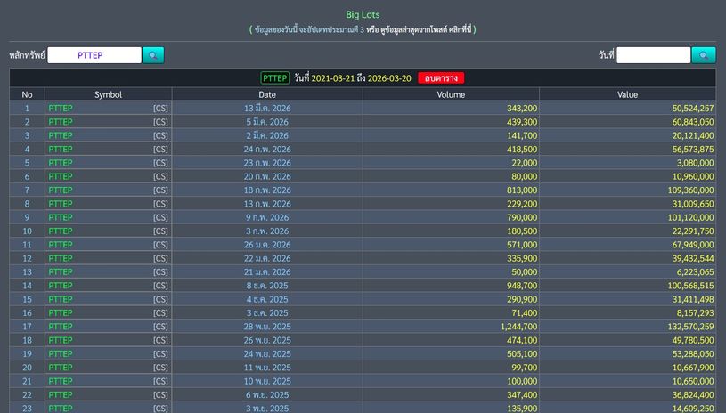 🔥BigLot 📅 20/03/2026 PTTEP มีมูลค่าสูงสุด 275.4 ล้าน ที่ราคาเฉลี่ย 153 บ.