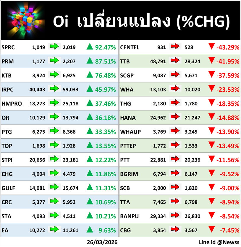 สถานะคงค้าง (Oi) 📅26/03//2026 📅 2026-03-26 21:10 ✎ administrator 🗇 TFEX 👍 - แชร์โพสต์นี้ สถานะคงค้าง (Oi) 📅26/03//2026