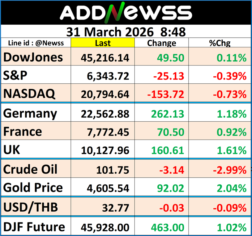 ทั้งนี้ ดัชนีเฉลี่ยอุตสาหกรรมดาวโจนส์ปิดที่ 45,216.14 จุด เพิ่มขึ้น 49.50 จุด หรือ +0.11%, ดัชนี S&P 500 ปิดที่ 6,343.72 จุด ลดลง 25.13 จุด หรือ -0.39% และดัชนี Nasdaq ปิดที่ 20,794.64 จุด ลดลง 153.72 จุด หรือ -0.73%