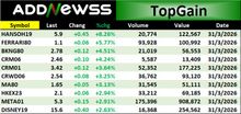 | Symbol | Last | Chg | %Chg | Hi | Low | Volume | Value | Date | Time | ☰ |
